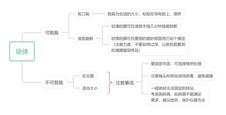1.塊體樣品。直接可以用導電膠粘在樣品臺上測試,若需拍塊體或者薄膜截面,需明確截面制備方法,一般可以通過剪刀裁剪或者液氮脆斷兩種方式來制備樣品。